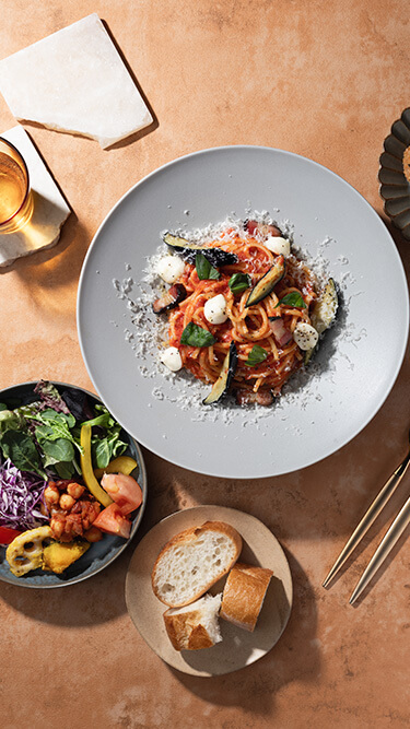 メインは、毎朝淡路島から直送される生麺を使った「全25種から選べる生パスタランチ」をお楽しみください。”トマト系“ ”オイル系“ ”2種のクリーム系“ ”ミート系“からなる5種類のソースと選び抜かれた5種の生麺の組合せ(5×5=25種)から生パスタを味わえるLUNCHメニューです。