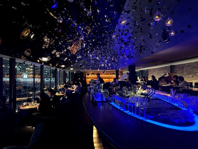 《青を基調としたリバーサイドメインフロア》窓際一面ガラス張りの全席リバービュー。デートや女子会でのご利用はもちろん、二軒目利用も。