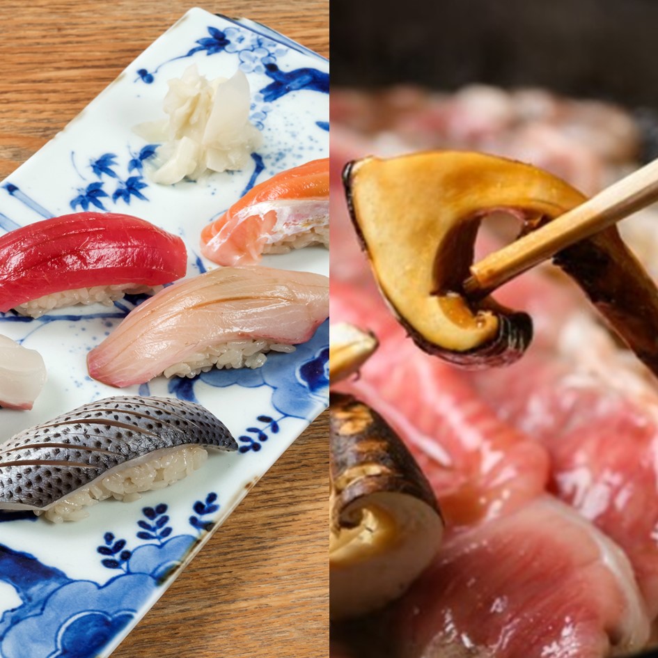 【紅(くれない)コース】 黒毛和牛の贅尽くし『松茸と黒毛和牛のすき焼き小鍋』『肉鮨&石焼ステーキ』『江戸前鮨5種』 5500円→5000円(税込)