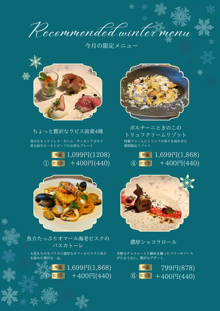 LAPIS-ラピス-では、13カテゴリーから成る100種類のメニューが楽しめるアラカルトや2名様~4名様限定のセットメニューなどシーンに合わせて利用いただけます アラカルトで自由にオーダーして、お子様連れや、三世代のご家族で楽しんだり!女子会やご夫婦、友人同士の食事会、デートでセットメニューをお得に楽しむもことも!飲み放題を付けて会社の飲み会で楽しむことも可能です!
