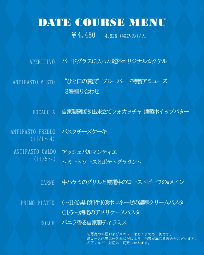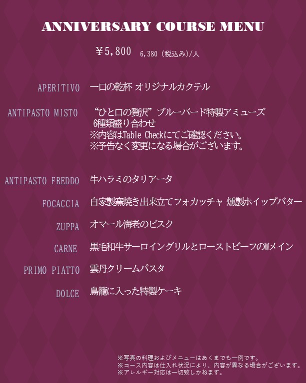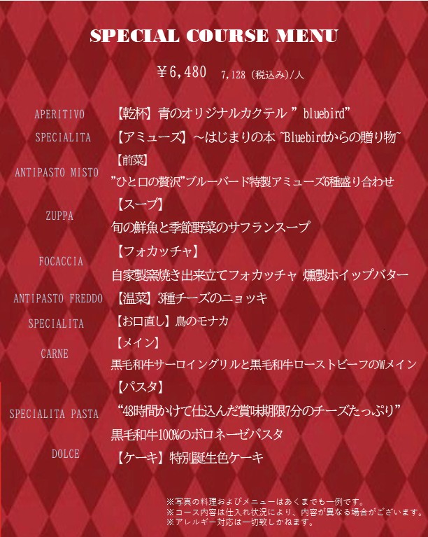 ・当店ではお客様の安全を第一に考え、アレルギーの対応を行っておりません。すべてのメニューがひとつの厨房内で調理をおこなっており、食器、調理器具などへの付着によりアレルゲン物質が混入する可能性があり、アレルギーをお持ちのお客様に安全なお料理はご提供できません。