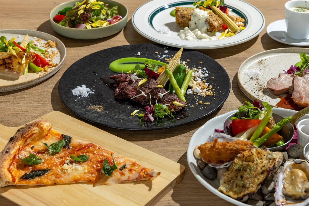 海を見渡せる、圧倒的な眺望へ。市内から車で20分ほどにある「OCEAN HOUSE」は、心地いい潮風を感じながら、180度のオーシャンビューを愉しめるシーサイドハウス。全ての席から海を見渡せる開放的な空間が、非日常な体験へと誘います。まるで宝石が散りばめられているようなサンセットの風景は、2人の時間を、より輝かせてくれるでしょう。テーブルを彩るのは、オマール海老や生牡蠣など、新鮮な海の幸を使った一品や、釜焼きピッツァ、炭火を使ったグリルステーキなど、バラエティに富んだ本格料理。「CALIFORNIA B.B.Q BEACH」の敷地内にオープンされた空間ならではの、異国の地に訪れたような感動と興奮があなたを待っている。ランチタイムにも圧巻の景色を、お愉しみいただけます。