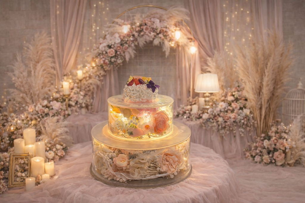 幻想的なアクアリウム空間で”オシャレなフラワーケーキ付”『牛ハラミのグリル&鶏もも肉のシュラスコ×チーズリゾット』など8品5皿