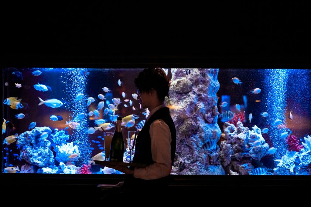 熱帯魚が優雅に泳ぐアクアリウム&ゆらめく照明が非日常に誘う空間へ。