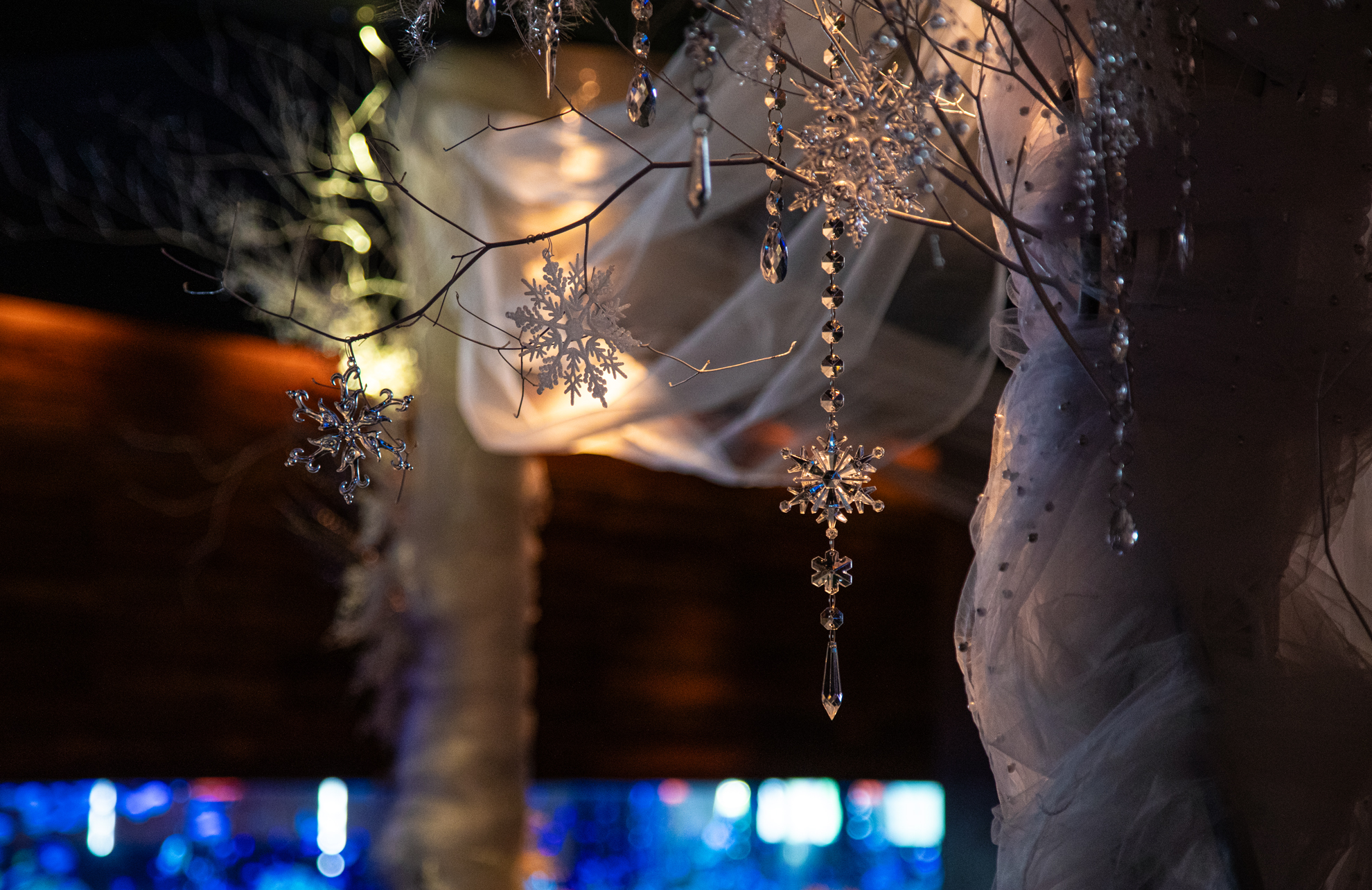 その先に見えるのは、雪化粧を施した都内最大級のアジアンリゾート空間に白く染まる枝木、そして水面に映るクリスタルの輝き。