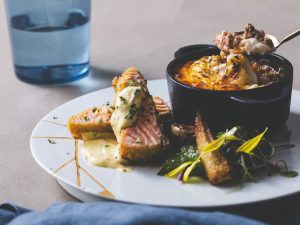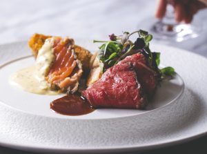 サーモンの香草パン粉焼き 温かいタルタルソースとハーブのサラダ黒毛和牛炭火焼きステーキ 黒ニンニクとフォンドボー