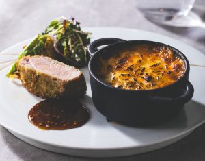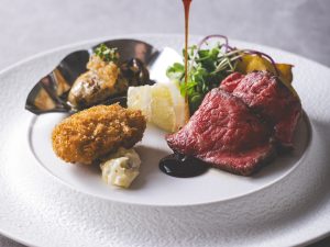 銘柄牛の炭火焼ローストと牡蠣のWメイン(牡蠣フライ・牡蠣グラタン)平日特別価格 ¥2,500 週末価格 ¥2,700