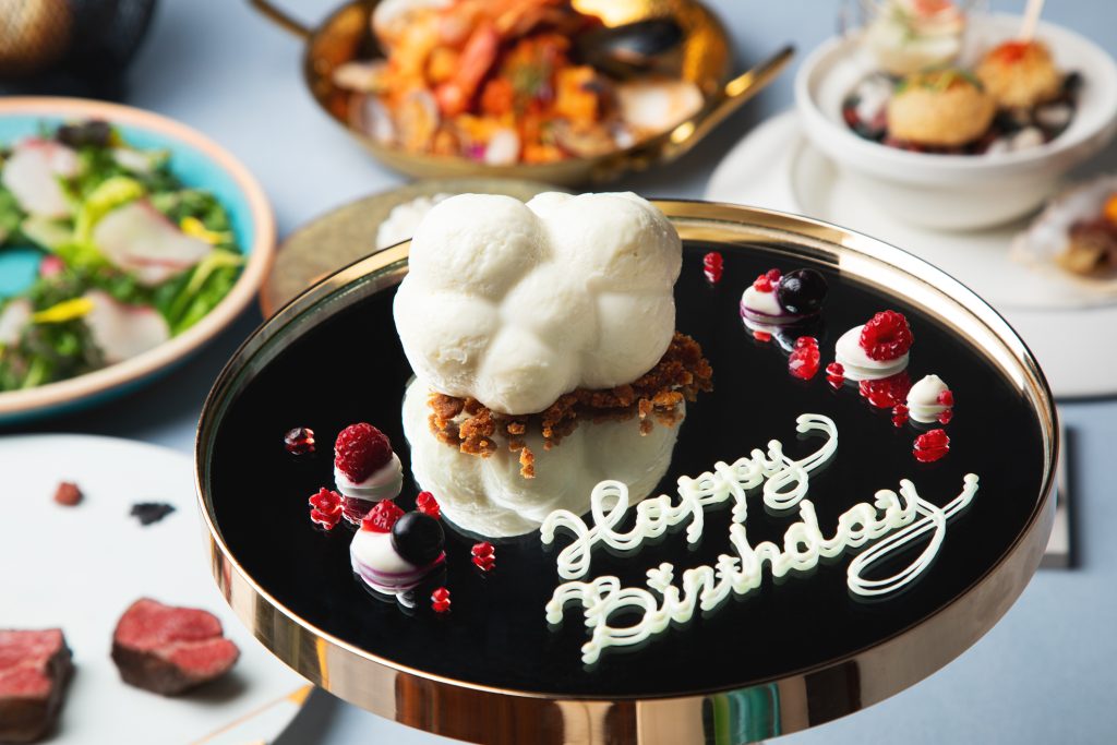 鏡面プレートの上に、雲に見立てたクラウドムースケーキを。