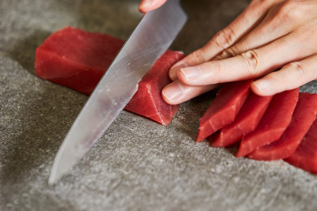 静岡県産キハダマグロ 。口に運んだ瞬間、上品でクセのないさっぱりとした旨みが広がり、舌の上でとろけるような食感をお楽しみいただけます 。