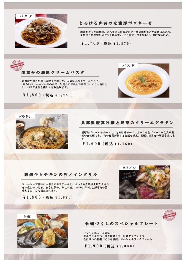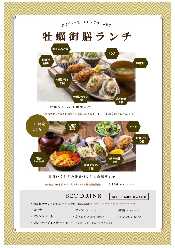 新鮮な牡蠣をいろいろな食べ方で楽しみたい方、オイスターバーの本格的な味を気軽にランチで体験したい方にぴったりの、至福のランチタイムをお約束します。