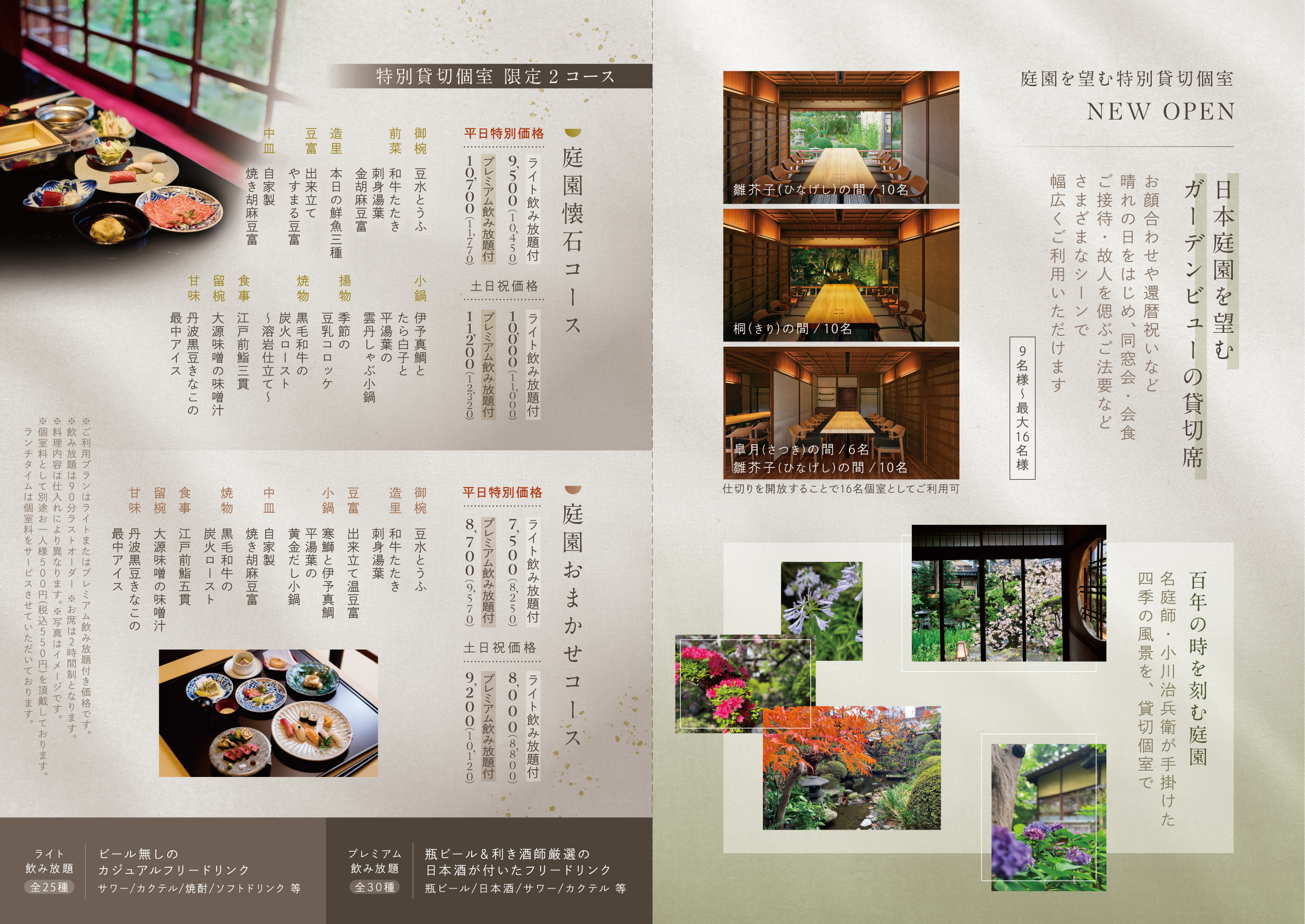 【日本庭園のガーデンビューで風雅にくつろぐランチのひと時】 季節の移ろいと共に表情を変える天王寺最大級の庭園を眺めながら、豆富と鮨と日本料理のランチメニューをお愉しみ下さい。